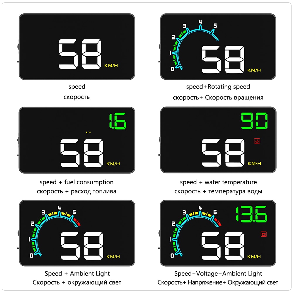 Vehicle speed, water temperature, voltage, fuel consumption, RPM, single mileage, total accumulated mileage, driving time, system time, intake pressure, acceleration test, free switch between kilometers and mileage, KM/h, MPH free switch, °C and °F Switch freely…